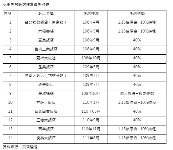 根據北市建管處資料顯示,北市危老核准案件今年累計已經突破700件,此次揭露去年已經歇業的老飯店「慶泰大飯店」,飯店基地面積約2百餘坪,在今年8月核准危老,順利取得1.15倍原容積獎勵,外加10%時程獎勵,統計北市危老核准共有神旺飯店、六福客棧、台北馥敦、宣美精品飯店、優美飯店、洛碁大飯店花華分館、台北國賓飯店、三德大飯店、西華飯店等14間飯店核准危老改建。