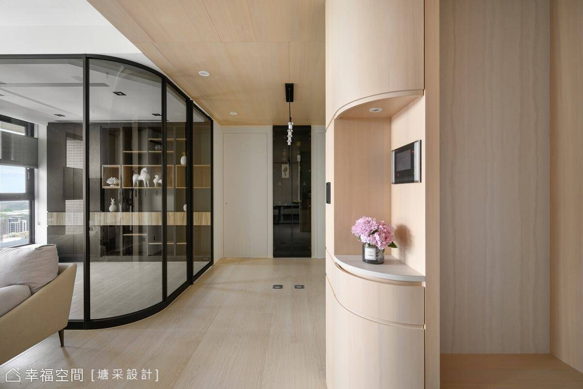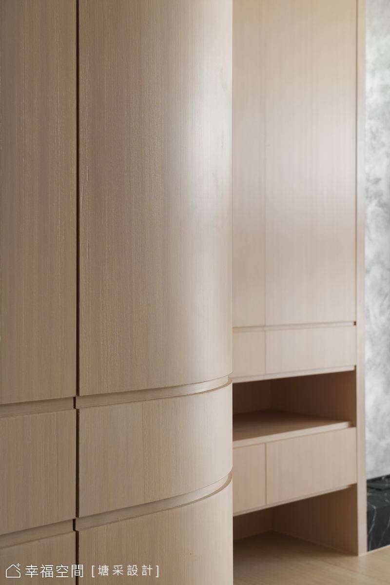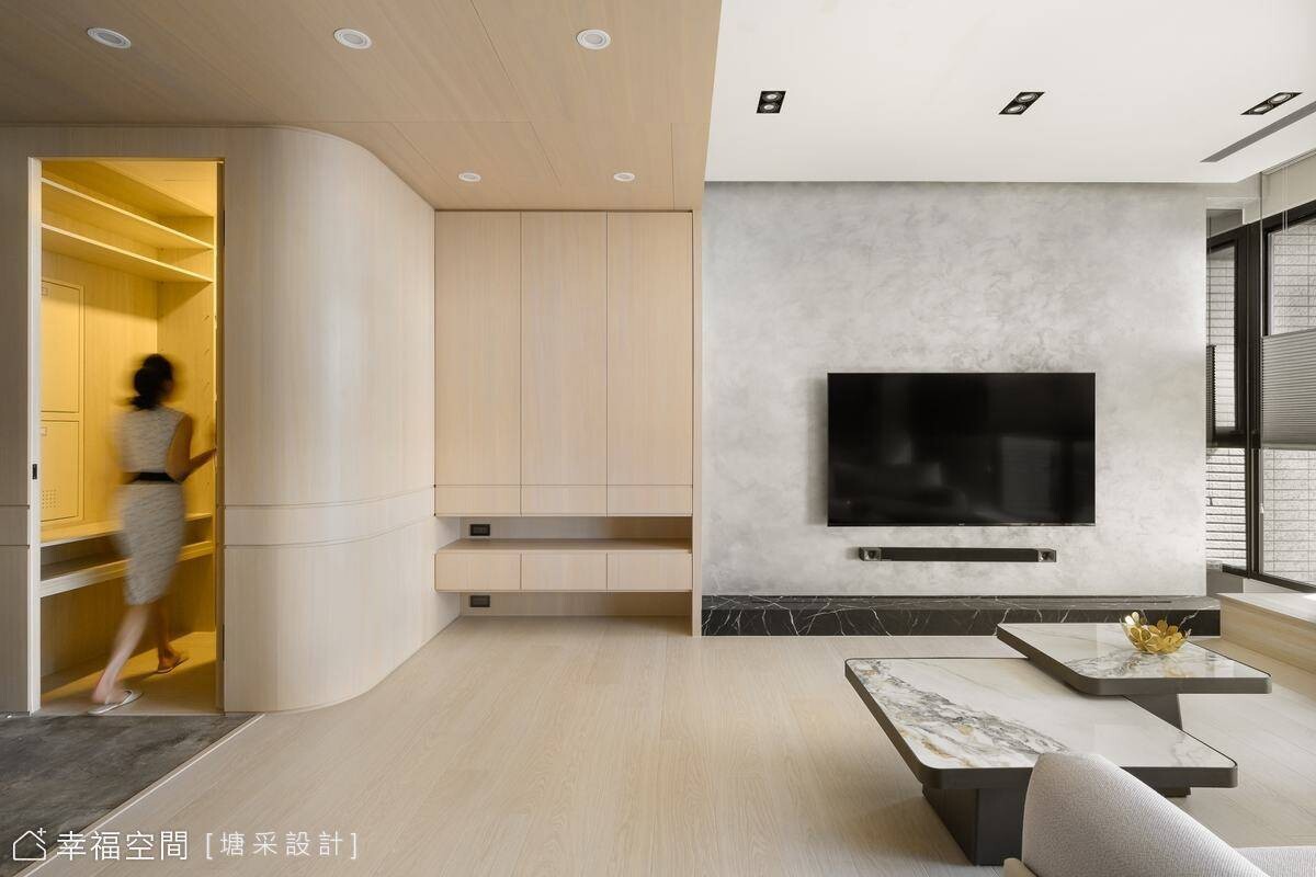 為求簡潔俐落、和諧一致的視覺美感,設計師從玄關為始,以隱藏門藏匿內部含有各式層板的儲藏室,並利用複雜精密的工法,砌築對稱的優雅圓弧,既挹注了圓融之意,與客廳後方的玻璃帷幕相互呼應,也在相繼連綿的視覺導引中,緩解一進門視線對上直角的銳利感,高度完整了連續性的主景。而集中收納的做法,則優化了零散的收納佈局,在整齊潔淨的畫面中,賦予屋主更多放置鞋子、行李箱及細碎生活用品的儲納空間。