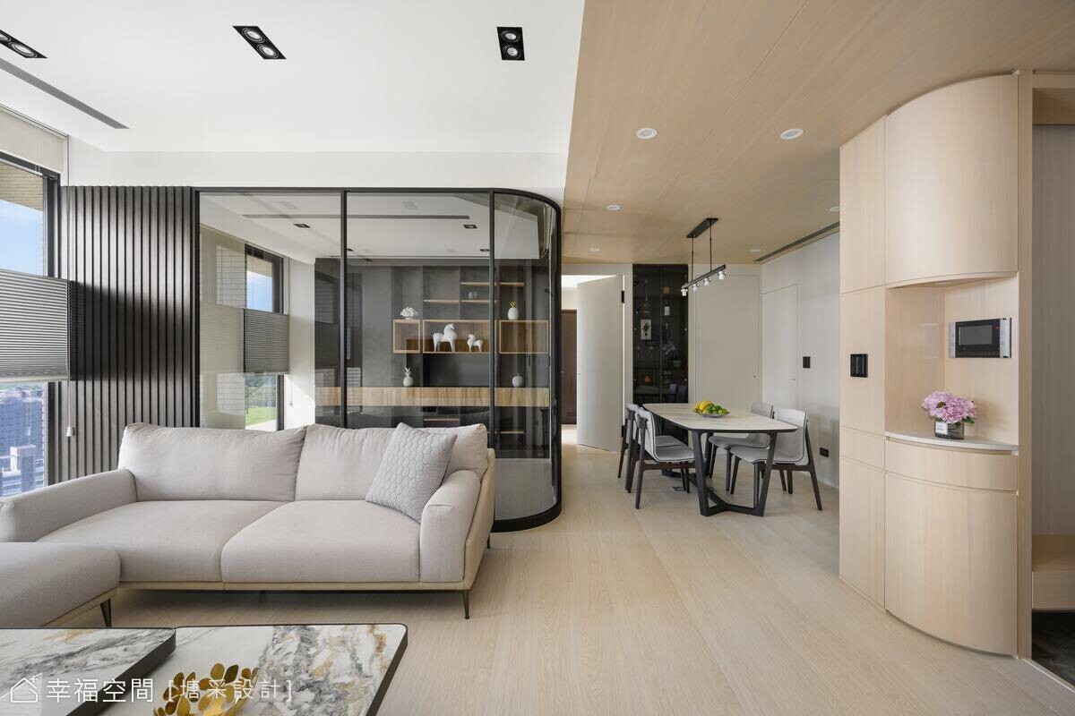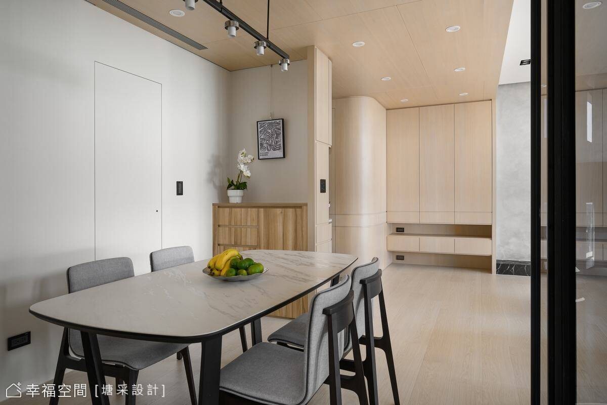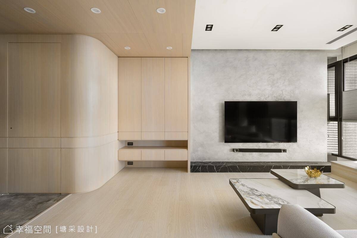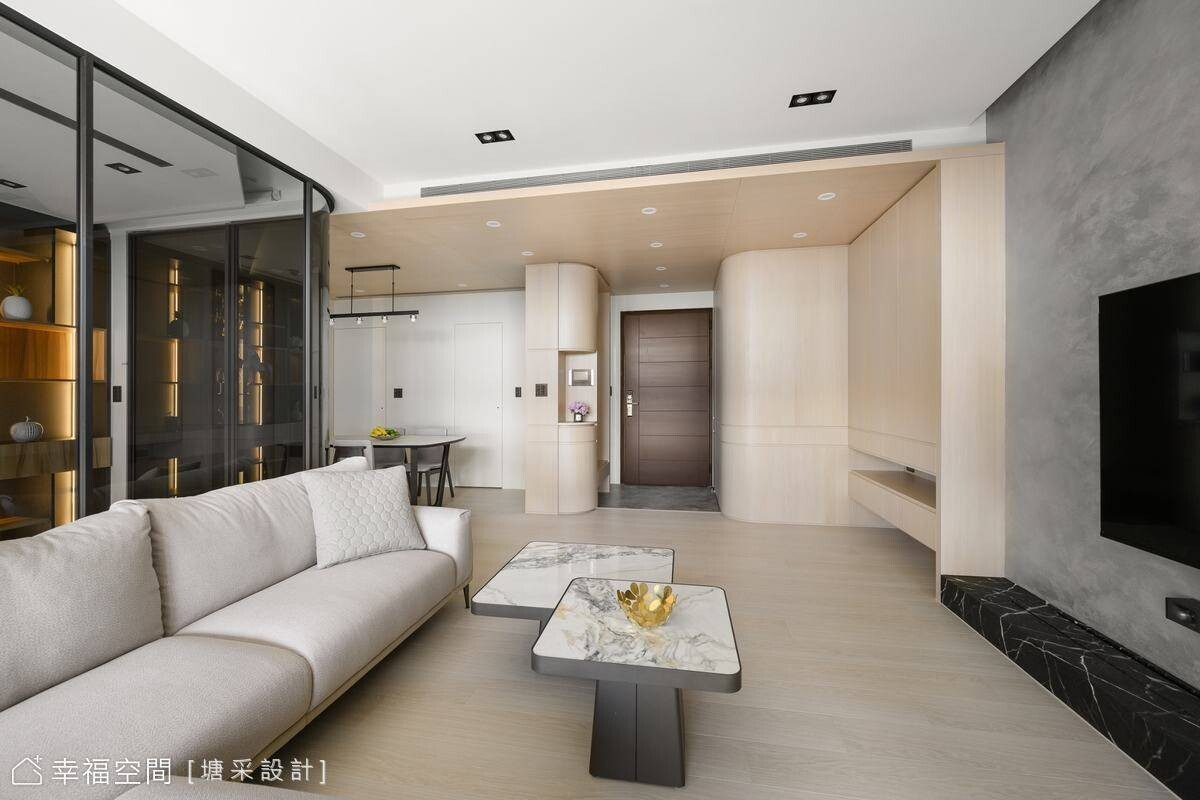 為求簡潔俐落、和諧一致的視覺美感,設計師從玄關為始,以隱藏門藏匿內部含有各式層板的儲藏室,並利用複雜精密的工法,砌築對稱的優雅圓弧,既挹注了圓融之意,與客廳後方的玻璃帷幕相互呼應,也在相繼連綿的視覺導引中,緩解一進門視線對上直角的銳利感,高度完整了連續性的主景。而集中收納的做法,則優化了零散的收納佈局,在整齊潔淨的畫面中,賦予屋主更多放置鞋子、行李箱及細碎生活用品的儲納空間。