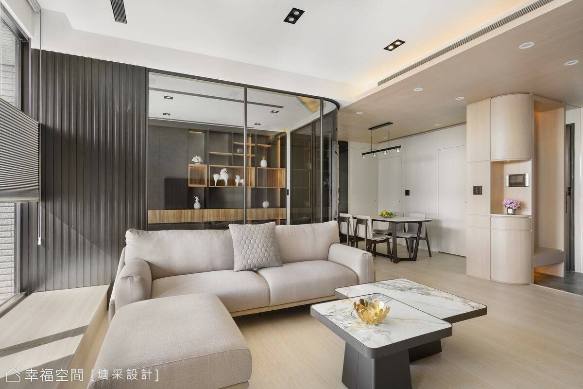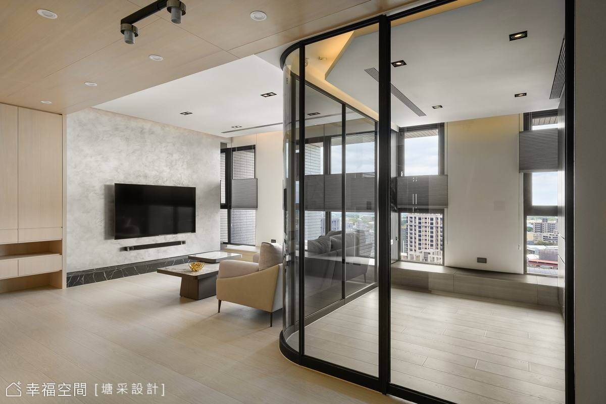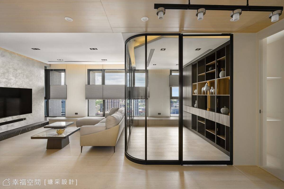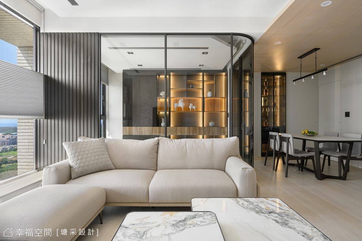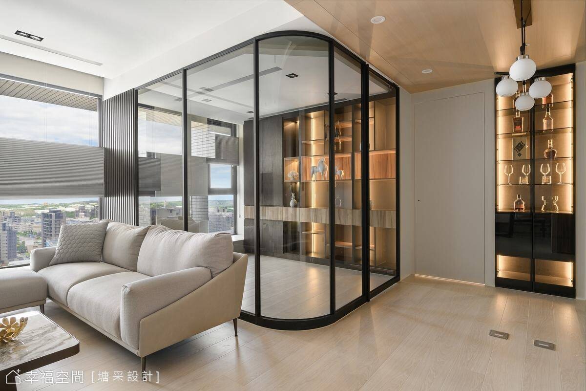 平時一人寧靜從容地生活,在逢年過節時又能與親友溫暖相聚,是客廳空間的核心理念所在。對此,設計師特別在窗邊規劃可移動式的收納臥榻,其能彈性擴增座位數,也能重新組拼移至房間作為雙人床架使用。善於收斂空間元素予以純粹景序的塘采設計,巧用簡雅沉穩、天生自帶高級屬性的灰玻,作為玻璃帷幕及展示酒櫃的主要材質,輔藉其包容性強的特色,整合起烈酒參差不一的色系,搭配細緻的條燈,使酒藏的高貴感再次推升。