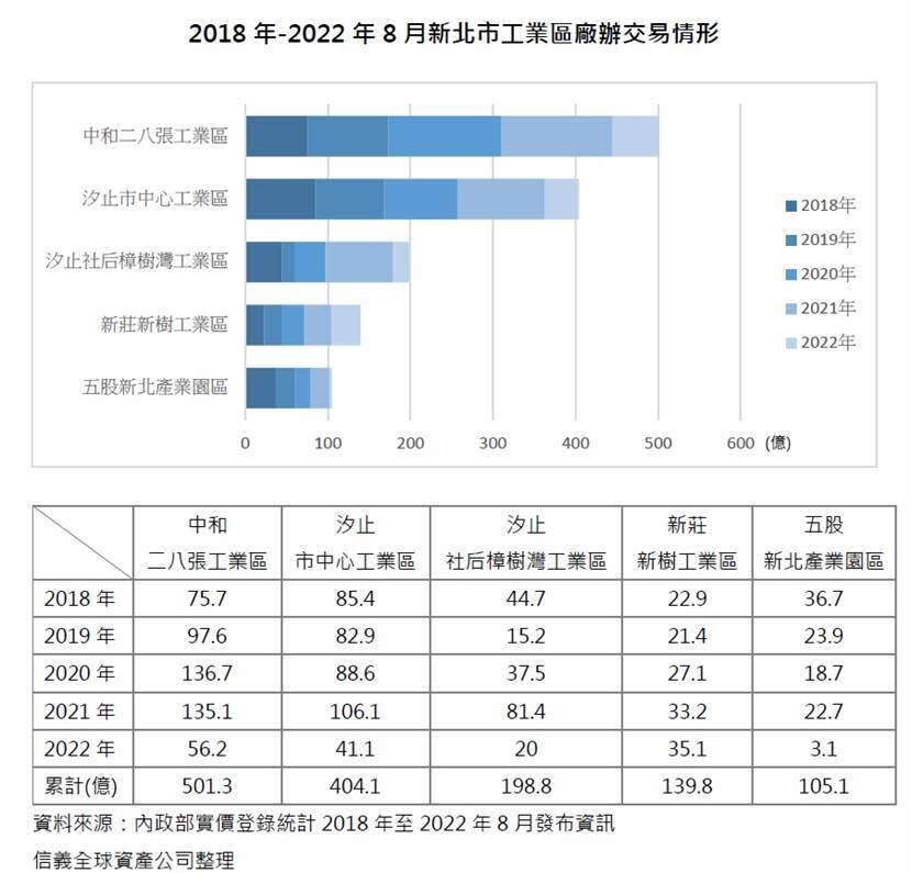 信義全球資產公司統計新北市2018年至2022年8月已揭露之內政部實價登錄資訊,近五年中和二八張工業區廠辦交易金額累計達501.3億,居新北市行政區廠辦交易規模首位;汐止工業區廠辦交易累計金額為404.1億居次,汐止社后樟樹灣工業區以198.8億位列第三,總合前三名就有破千億的交易規模。