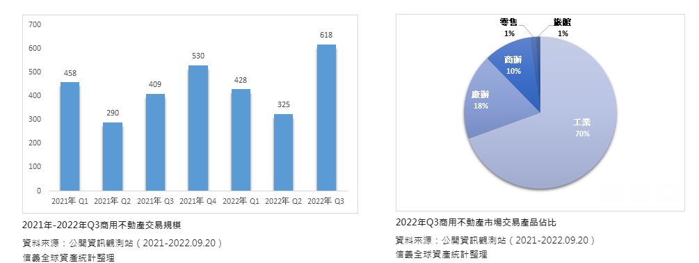 根據信義全球資產公司統計2022年7月至9月20日上市櫃法人大型交易,總計Q3商用不動產交易金額為618億,創下今年單季交易總額最高,較前一季大幅增加90%,也較去年同期增幅約51%,此外,也創下有統計以來單季交易總額次高的紀錄。加總今年前三季交易額達到1,371億,較去年同期交易額1,157億,也成長了18%。