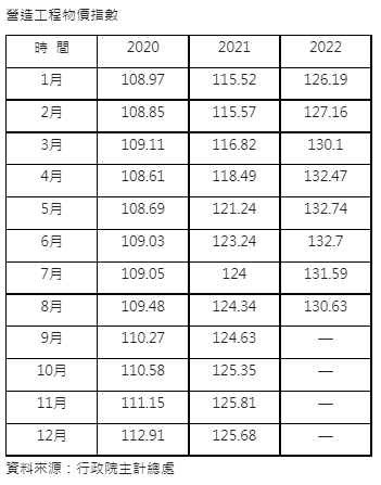 根據行政院主計總處營造工程物價指數統計,從2020年9月營造工程物價指數突破110後,後續就開始一路上揚,今年5月創下歷史新高的132.74,不過短期內隨原物料價格走跌,營造工程物價指數也出現漲不動的現象,甚至連續3個月下跌,修正至130.63。
