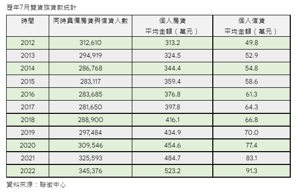 根據聯徵中心統計,過去房市較為低迷的時期,2014~2018年雙貸族數量相對穩定維持在28~29萬人,但隨房市景氣復甦,市場對資金需求增加,房市越熱雙貸族的數量越多且金額也越高,今年7月雙貸族人數、金額都創下新高。