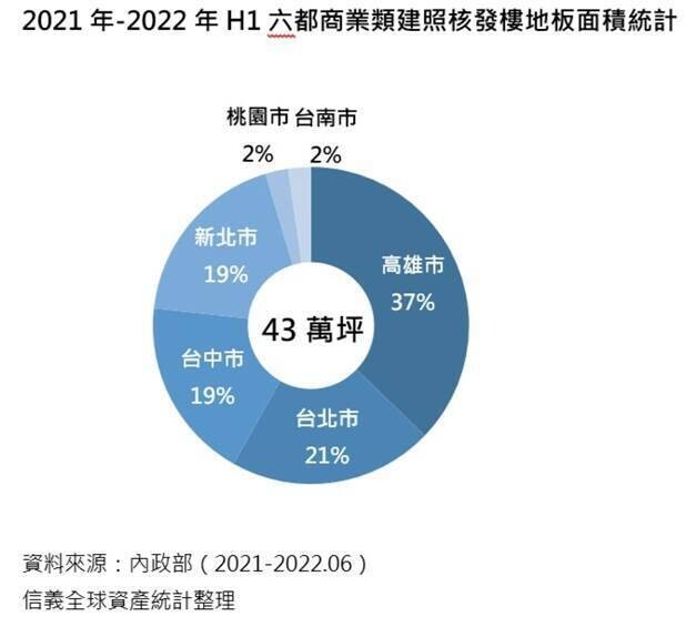 自2019年底起,疫情蔓延全球,重挫實體店買氣,但隨著邊境解封,休閒觀光、實體店面逐步回溫,投資人也重拾信心,布局商用不動產。從內政部公布之建照核發統計數據可觀察到,2021年至2022年H1六都商業類建照核發總樓地板面積為43萬坪,其中台北9萬坪、高雄16萬坪,佔六都商業類建照核發總樓地板面積超過5成,隨著疫情趨緩,北、高商圈百貨市場將熱鬧登場。