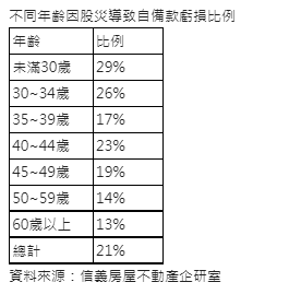 年齡調查部分,可能越年輕的投資人對於風險承受度越高,相對面臨今年的股災也會相當有感,調查顯示,未滿30歲的購屋人,有29%受訪者的自備款受損,其次則是30~34歲約有26%的人自備款受損,其次則是中產階級的40~44歲,約有23%的受訪者,自備款因股災虧損,年齡越大則相對保守一些,50歲以上因為股災自備款受損的比率則在13%、14%。