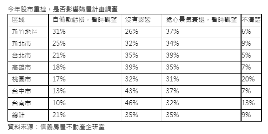 以區域來看,新竹是受股災影響相對顯著的區域,調查31%的受訪者自備款虧損,暫時觀望,其次則是新北市的25%與台北市的21%,雙北市研判應是中產的比例相對較高,因此受到的影響程度也比其他都會區高。