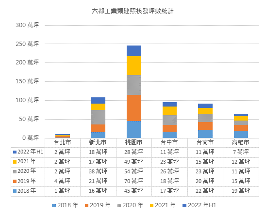 觀察近五年工業類建照核發坪數,桃園市2018年至2022年H1累積總面積為246萬坪,居六都第一,信義全球資產公司林建勛經理分析,建照核發呈現出來的是市場未來供給,從桃園建照核發面積衝高,意味市場對工業地產發展前景持樂觀態度,近年受惠於台商回流、政策推動大型開發案,除建設公司投入工業地產相關產品開發,企業端也積極覓地自建,或將既有廠房改建為新型立體化廠辦,完工後除營運自用,也可彈性將部分空間進行租售,活化資產同時創造收益。