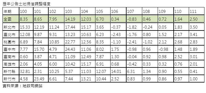 地政司的資料顯示,從2017年開始全國公告土地現值調幅-0.83%~2.5%,調整幅度都相當低,若反應過去一年的房價大漲,則今年的公告土地現值調整有機會挑戰連五漲。