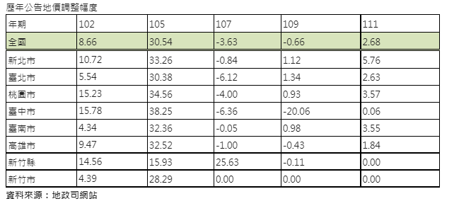 至於公告地價部分,過去三次調整全國分別調降3.63%、調降0.66%,去年才又調漲2.68%,由於公告地價兩年一調,後年調漲的機會相當高。