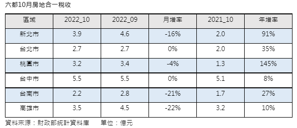 比較10月六都個人房地合一稅收,稅收最高的仍是台中市的5.5億元,較上月持平,其次則是新北市3.9億元,月減16%,高雄市3.5億元,月減22%,台南市為2.2億元,月減21%,南台灣的房地合一稅收月減幅度都達2成,市場明顯降溫。