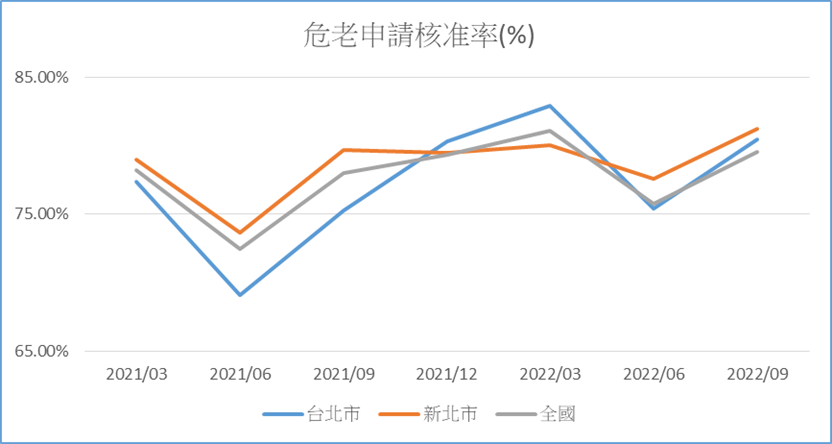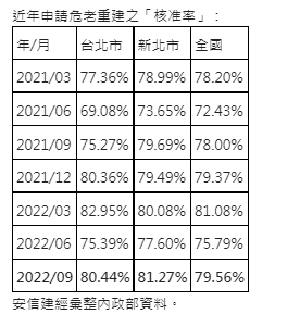 安信建經彙整內政部資料指出,截至今年9月底為止,台北市危老申請件數為910件,核定件數為732件;雖然申請件數僅季增4件,但核定件數卻大增49件,核准率衝高至約80.44%,不僅較今年6月與去年同期雙雙上升逾5個百分點,更為統計以來,北市核准率次高的紀錄。