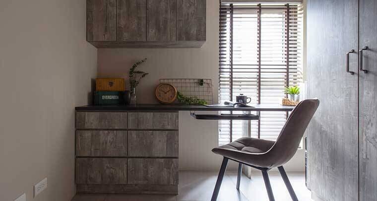 考量屋主一家存有大量的琴譜、書籍與音響設備,書房則利用上下櫃及高櫃的組合,滿足大容量的收納需求,而歐德傢俱秉持高度客製化的精神,融入熨貼人心的細節巧思,量身訂製出符合琴譜尺寸的櫃體樣式,完美回應屋主對於生活質量及便利性的訴求。此外,櫃體表面選用「斑駁灰」的面材,其粗獷的質地及復古風味,詮釋了輕工業風別樣的頹唐美感。