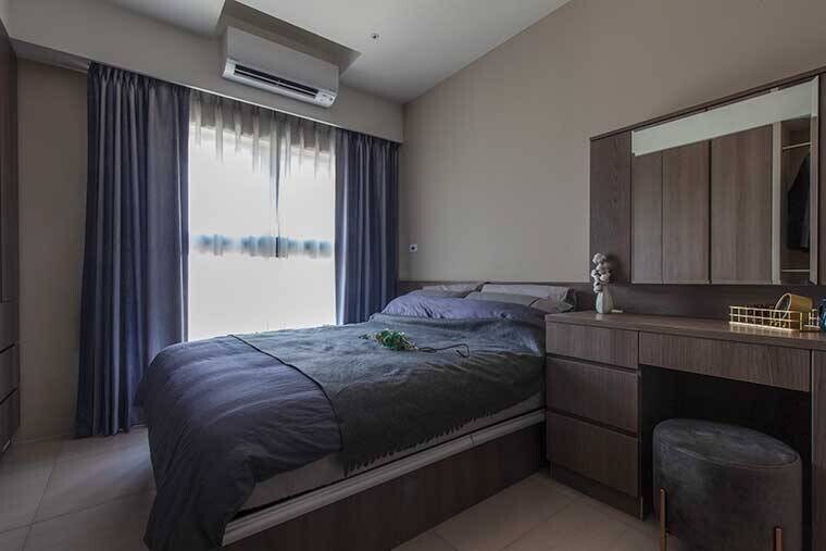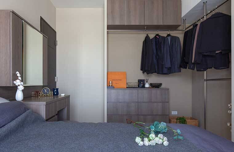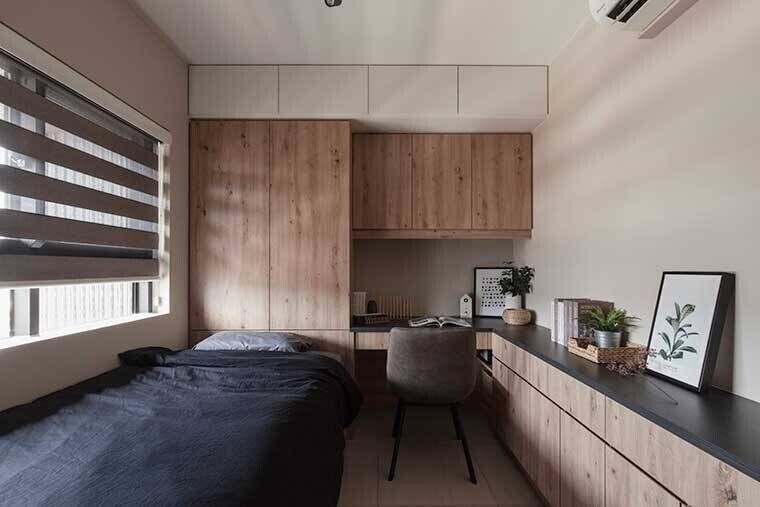 面對坪數不大的主臥房,設計師巧妙以上下櫃結合吊衣架,取代常見的置頂高櫃,藉此消弭厚重壓迫之感,搭配掀床設計,讓整體更顯舒適軒敞。空間延續公領域的風格調性,援引從百葉窗流淌的自然光,隨著沉穩雅致的木質語彙,留一份恬淡靜謐的心境。由於屋主女兒特別喜愛「小木屋」溫馨質樸的感受,次臥房以清新雅潔的色系鋪敘,擷取木紋肌理的深淺變化,營造出自在無拘的休閒況味。機能上除了以L型的設計串聯衣櫃、書桌檯面、展示平檯及多元櫃體,增加使用彈性,並順著橫樑結構,打造出可置放CD專輯的白色收納櫃。