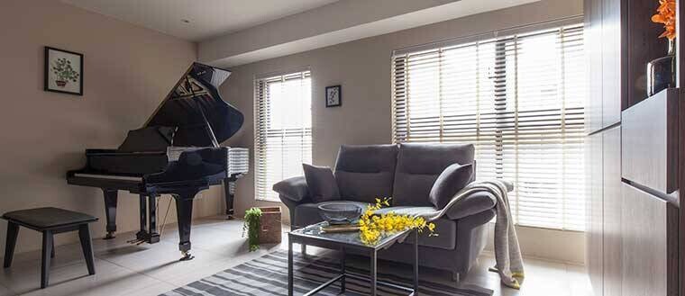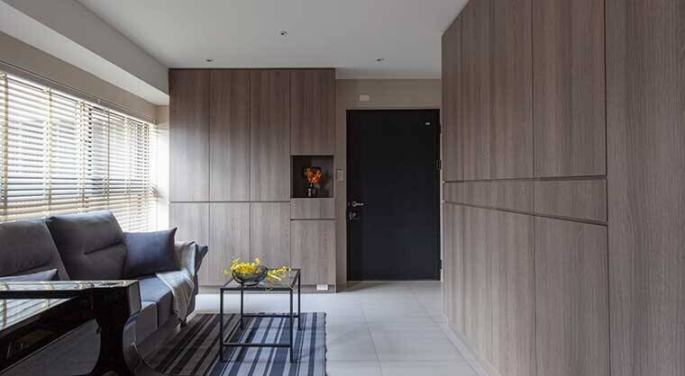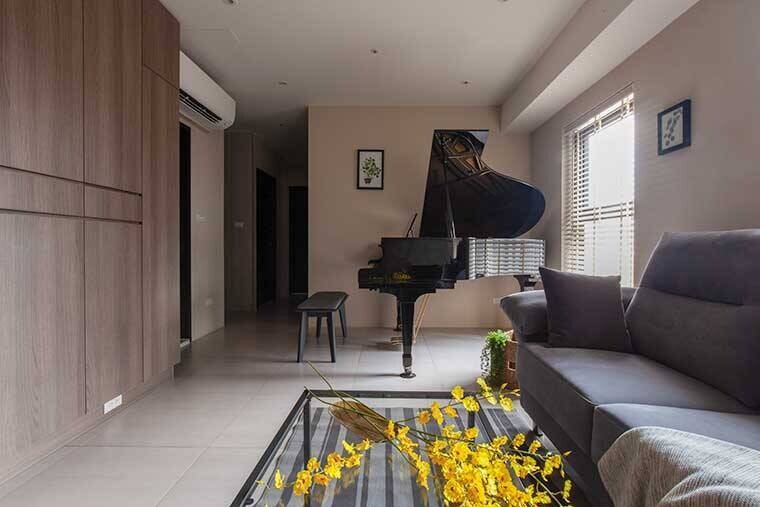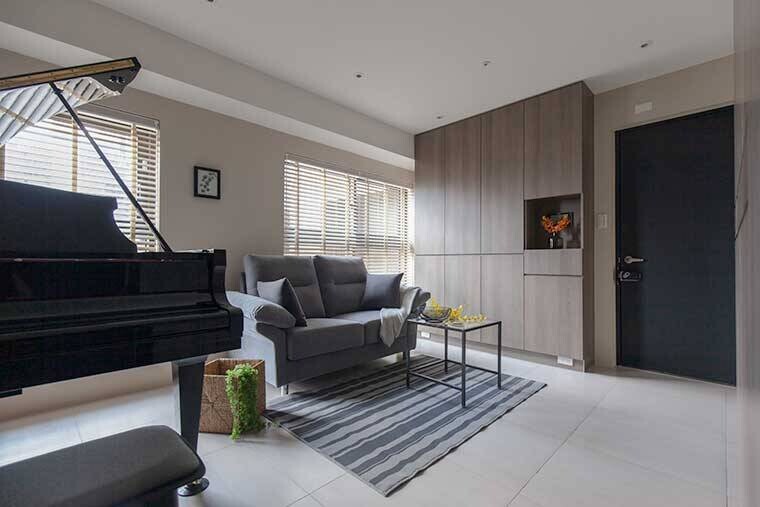 本案為一對音樂家夫婦的溫馨雅居,期望18坪的小空間裡,擁有教琴、演奏的地方之外,也能享受咖啡廳般放鬆無壓的氛圍。因此,曾俊傑設計師審慎思考三房一廳的格局,針對居住者一家的日常習性,歸整出舒適合宜的生活機能與動線,並善用原本的採光優勢,賦予寬敞開闊的視覺感受。打破電視主牆既有的設定,公領域以一架三角鋼琴為核心,採用歐德傢俱的系統櫃作為主體及玄關鞋櫃,簡潔明快的佈局配置,不僅打造出居家版的小型演奏廳,亦增添了實用的收納機能,成功發揮小坪數的效益。