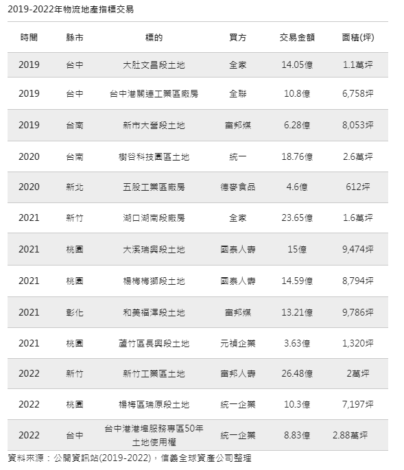 信義全球資產公司顧問發展部經理林建勛分析,從近年商用不動產實際交易情形可以觀察到,企業主積極布局工業土地、廠房等物流地產,例如:電商業者momo以13.21億元於彰化和美取得9,786坪土地,並在今年初宣布投入75.7億元興建中區物流中心及採購倉儲設備;統一企業也以18.76億元取得2.6萬坪樹谷科技園區土地,規劃統一新市物流園區,預估明年可以完工啟用。