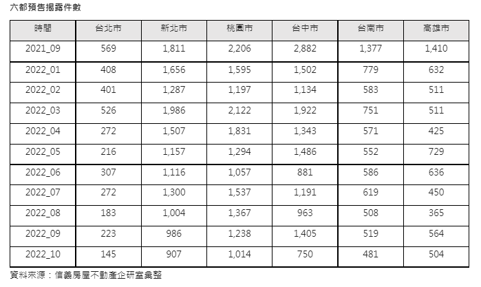 信義房屋統計官方預售實價揭露件數資料,2021年9~12月房市景氣高峰時,平均單月預售揭露的件數可達1.2萬件,單月揭露的總銷售金額可達1700餘億元,不過今年下半年房市吹冷風,從5月起連續半年的預售揭件數都跌破7000件,較去年旺季腰斬,一手市場向來是房市領頭羊,一手市場降溫也反映房市進入盤整期。