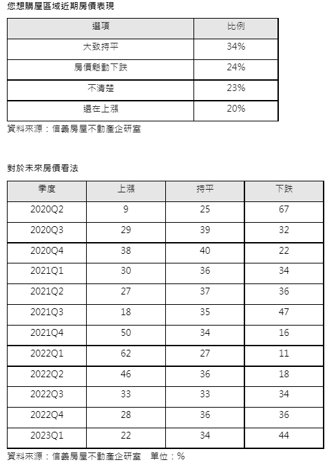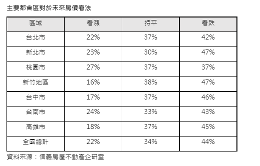 信義房屋針對官網的使用者進行調查,調查結果顯示,今年第一季市場最樂觀的時候,有高達62%的人看漲未來房價,不過逐季持續收斂,這季調查看壞的比例是看好的兩倍,有44%看跌未來房價,剩下22%看漲未來房價,34%認為未來房價持平。