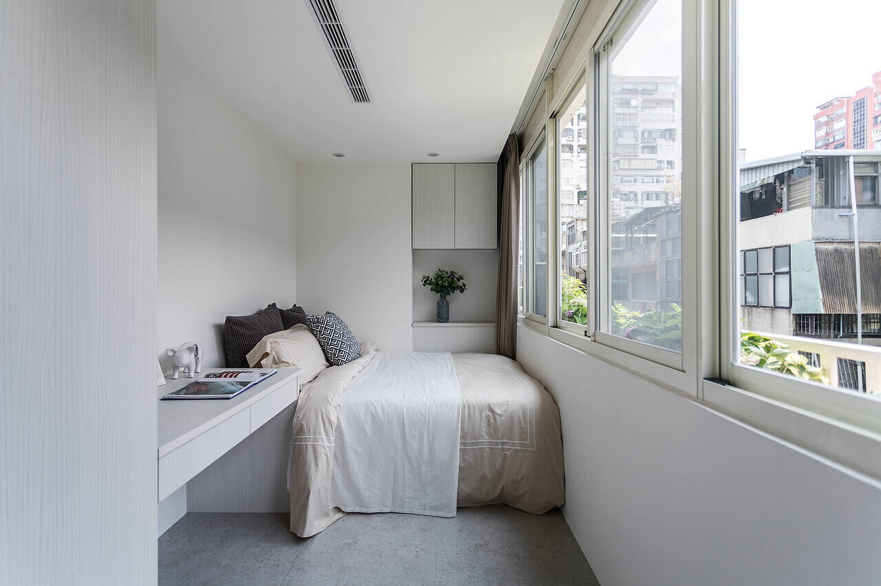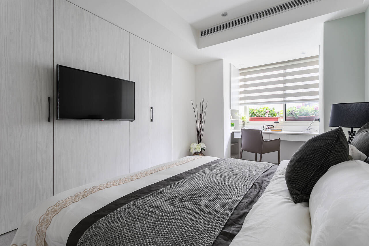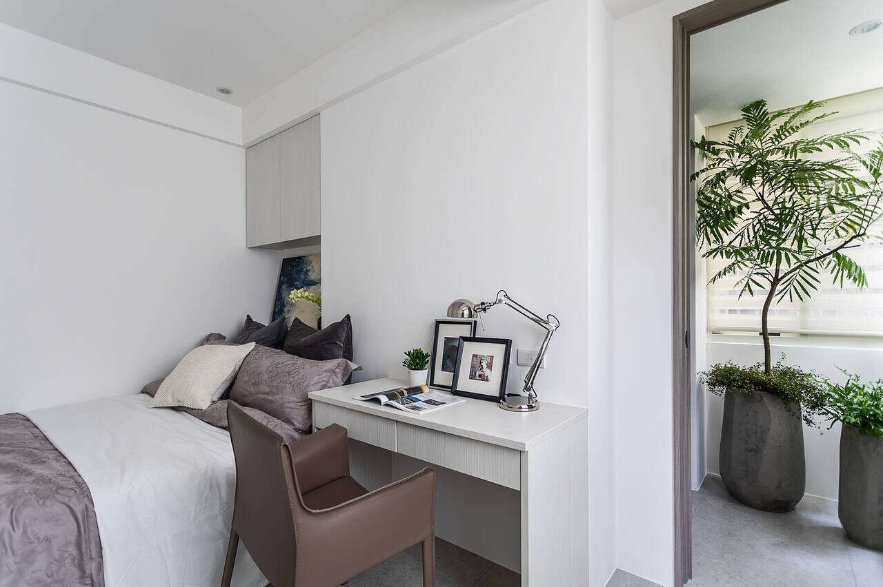 設計師確保每個空間都擁有足夠採光與齊備的雙人床、書桌與衣櫃,主臥室也不例外,線性隱藏式的冷氣出風口,確保了本來樓高就不高的空間不會因機體顯得更狹隘,全室配色以舒服、簡單為主,另以少量深色材質與迎光面綠植作為點綴。