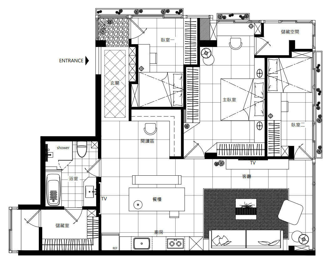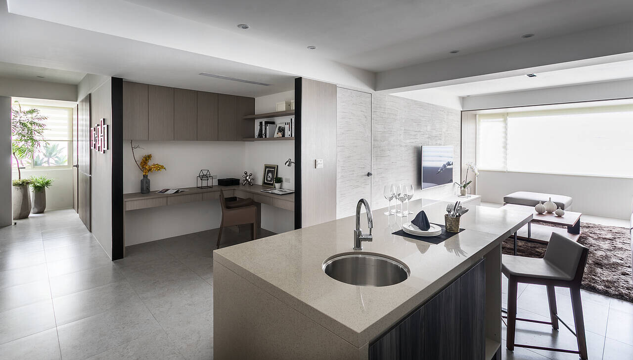 本來是計畫要把舊公寓轉賣而進行翻新的業主,除了最初驚訝於苡希設計對於格局跳脫框架的大膽想像,最後也因為太滿意成果而決定要自住,在換然一新的家裡面,女業主最喜歡坐在廚房吧檯旁的高腳椅上,這個位置能一覽從門口到客廳的全部空間,掌握家中每個成員的動向,也是整個空間格局開闊性與連貫性的體現。從這個圖中也能看到雖然移除了書房,設計師仍保留了一個由畸零空間改造而成的開放式閱讀區,而三個房間裡又各自擁有書桌與衣櫃,在三十坪的空間裡做到極致的兼顧整體動線與機能性。