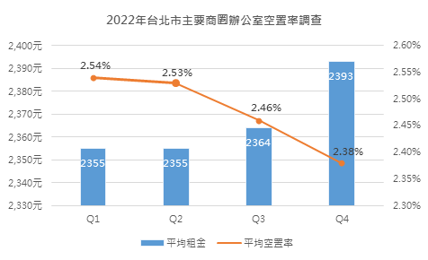信義全球資產公司公布2022年台北市七大主要商圈辦公室空置率調查,結果顯示,台北市辦公室空置率持續下探,至第四季僅剩2.38%,刷全年最低紀錄,顯示商辦市場趨熱。對此,建設公司在推案策略上已有所調整,轉向辦公室、廠辦類商品,且著重打造具智能永續概念的頂級辦公大樓,未來新案進場可望帶動整體租金行情,展望2023年趨勢,整體商辦市場將朝向租金緩漲、供需漸穩的方向發展。根據信義全球資產公司調查,北市商辦各季空置率走勢呈現連三降,第四季更創下空置率2.38%,為各季中最低,相比第一季2.54%,減少了0.16%,顯示由於市區近年未有大規模商辦大樓新增供給,且不少老舊商辦投入都更危老重建,導致商辦持續處於供不應求,空置率續低,使整體租金緩步上揚,第四季平均租金為每坪2,393元,相比第一季成長約2%。