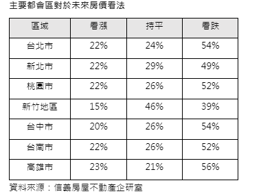 若以區域房價看法,過去一段時間的房價高漲區,看漲比例維持在2成左右,但看壞比例不少都已經達到5成,看法相對樂觀的反而是新竹地區,看漲雖然只有15%,但看跌也只有39%,看跌房價比例明顯少於六都。