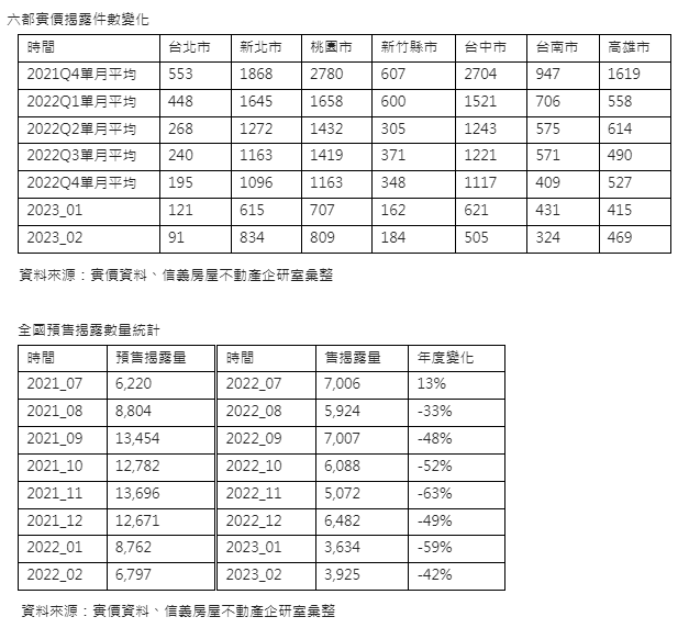 統計顯示,從去年3月預售揭露單月還在1萬件後,預售揭露件數就明顯下滑,去年下半年單月維持在5000~7000件,今年前兩月目前揭露單月不到4000件,反應市場對於平均地權條例修正已經提前發酵,投資退場交易量縮,市場個案銷售速度拉長,市場也沒有上漲動能。