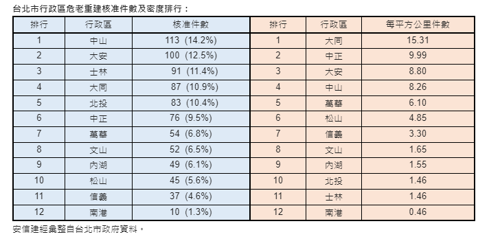 安信建經彙整統計顯示,台北市危老核准件數最高的行政區為中山區,共計達113件,占全市核准件數約14.2%,其次為大安區有100件,所占比例約12.5%,分居3到5名的士林、大同、北投區占比也都達到一成以上。若以危老建案數量密度看來,排名前五則為大同、中正、大安、中山、萬華,顯示中山、大安、大同區不論數量或是密度都在前五名之列,其中排行第一的大同區每平方公里更有高達約15.31個危老建案,遙遙領先第二名中正區的9.99個。