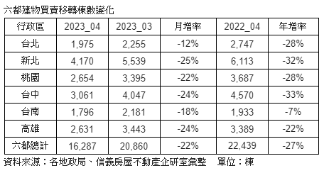 根據六都公布的買賣移轉棟數資料顯示,4月的買賣移轉棟數反映3月市場較去年同期衰退,加上今年4月份工作天數也較去年同期減少約1成,因此4月買賣移轉棟數1.6萬棟,年減達27%,月減也達22%。
