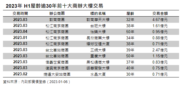 據實價登錄資料顯示,今年上半年北市屋齡30年以上的商辦大樓成