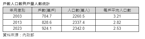 根據內政部統計,2023年底平均每戶人口數量僅剩下2.53人