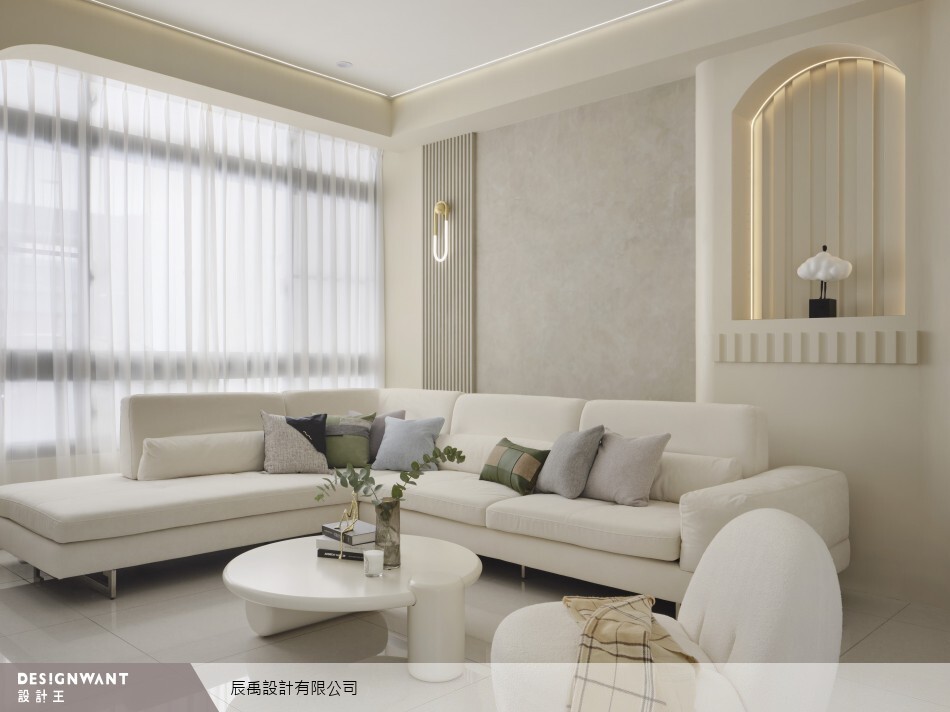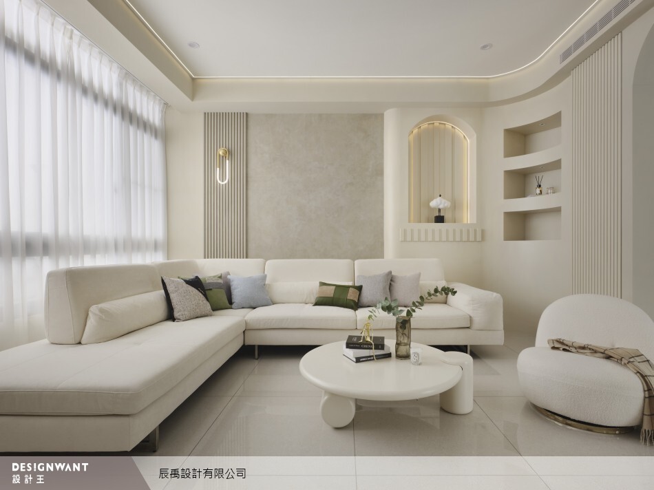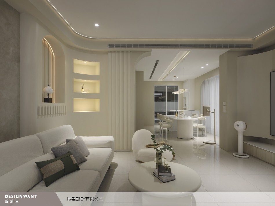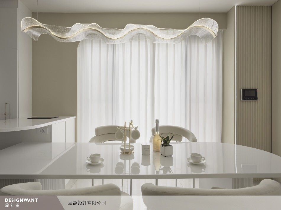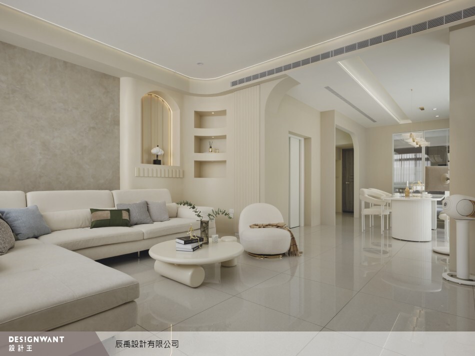 劉家余設計總監分享,在此案的空間中線條使用、比例拿捏都是設計時特別注意的重點,從圓弧的弧度,線板的位置,門窗的收邊,彩帶的燈飾,所有對應的關係和配搭,辰禹設計團隊都經過縝密思考和計算,讓線條與設計感能在空間中可以相互呼應,能單獨成為空間亮點,卻又同時融入整體空間氛圍和動線中。