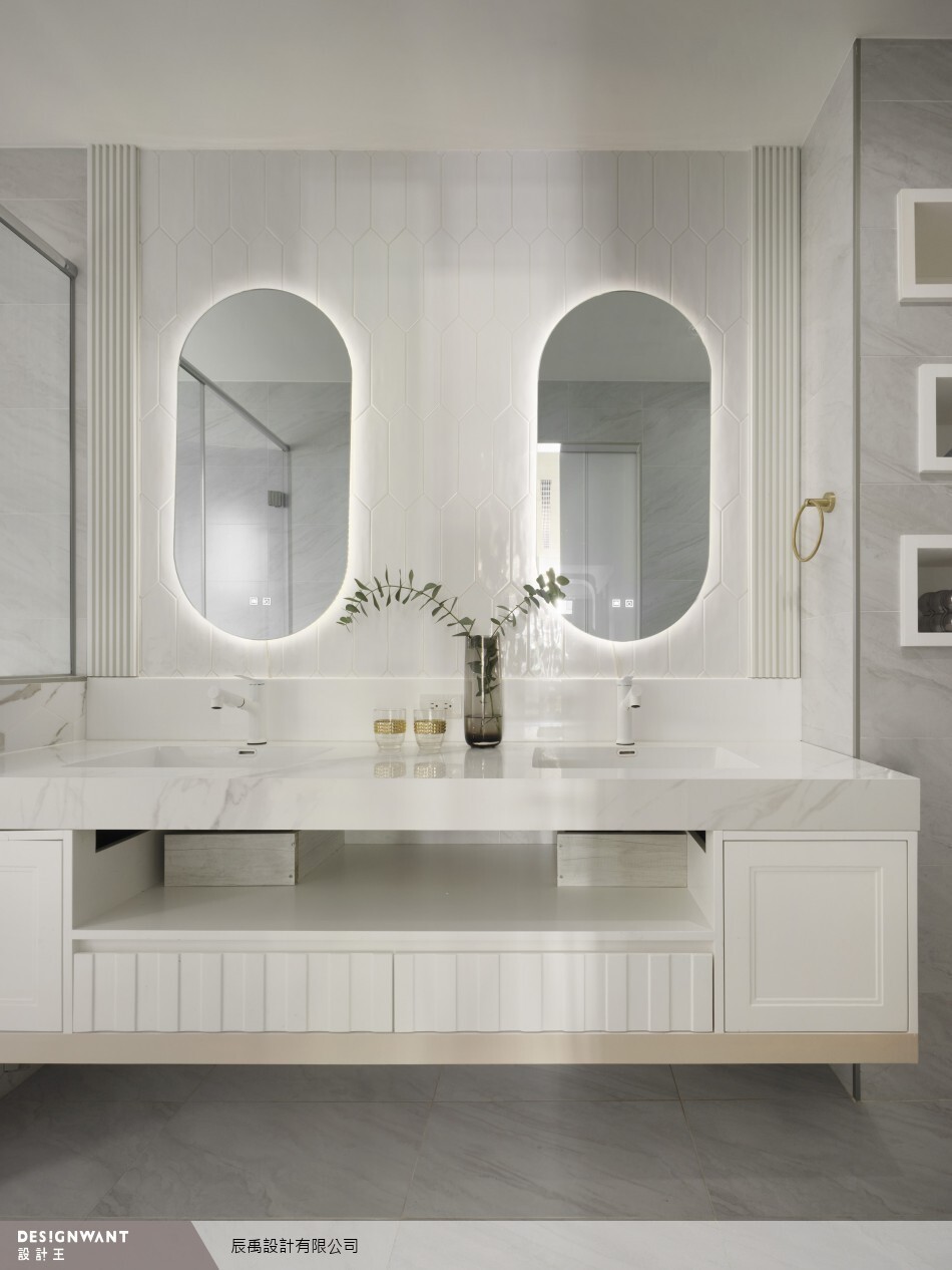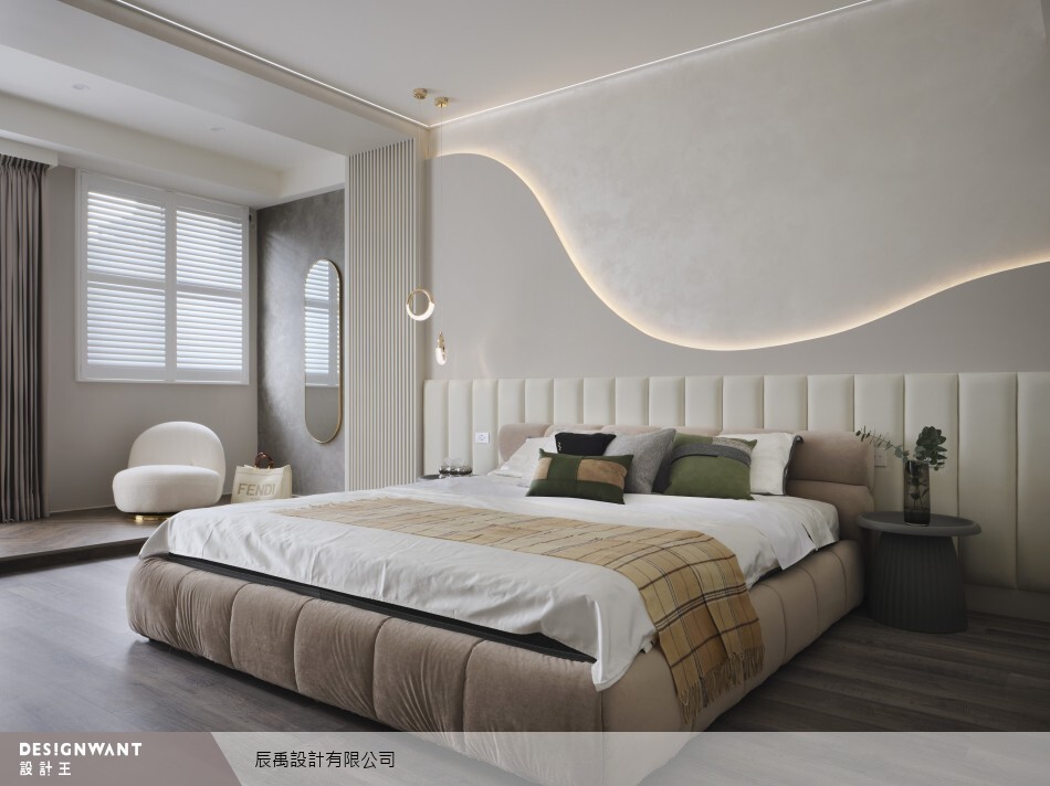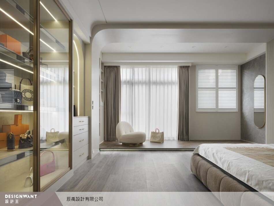 辰禹設計表示,在空間中的擺飾是為讓設計感更聚焦,凸顯設計細節,古典美學以柔和圓潤為主,現代風格以俐落簡約為主,所以在客廳和主臥室空間中都以直線線板和圓弧的門窗造形搭配,讓古典中有著現代風格。在主臥中的收納儲物衣櫃,以金邊烤漆線條收尾,華而不俗,亦能展現屋主收藏各種精品;而S曲線的床頭襯板和弧形化妝鏡,用柔和線條,讓主臥呈現溫柔、Soft的愜意放鬆感,讓身心靈宛如進入一處溫柔鄉。