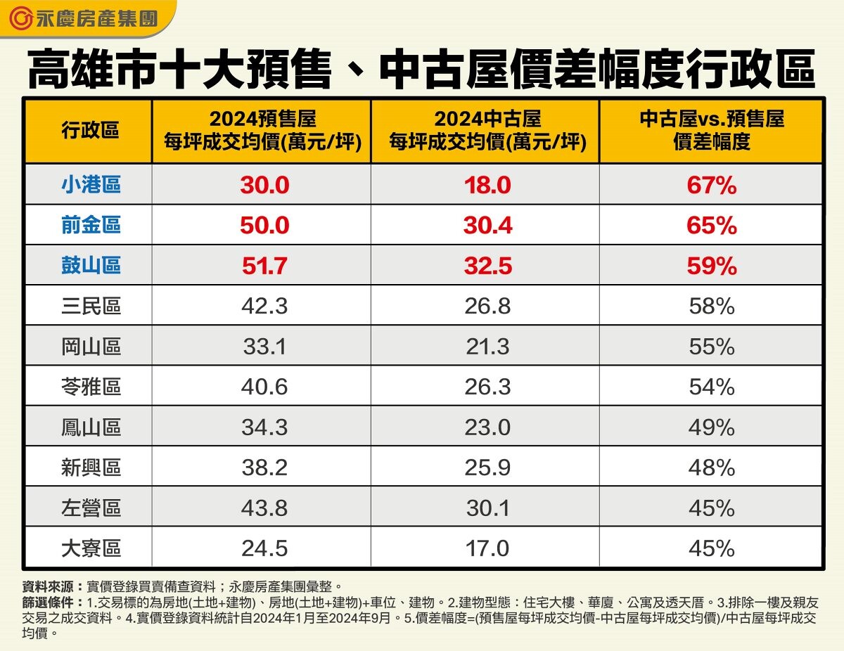 隨著高雄科技產業進駐及重劃區開發,高雄房市熱度不減,但大量推案帶動預售屋價格高漲,使得中古屋的高性價比愈加突出。永慶房產集團統計實價登錄數據指出,高雄市今年中古屋與預售屋單坪價差高達六成,小港區、前金區及鼓山區名列前三,每坪價差至少10萬元。對於購屋預算有限的首購及小資族來說,中古屋成為實現購屋夢想的重要選擇。