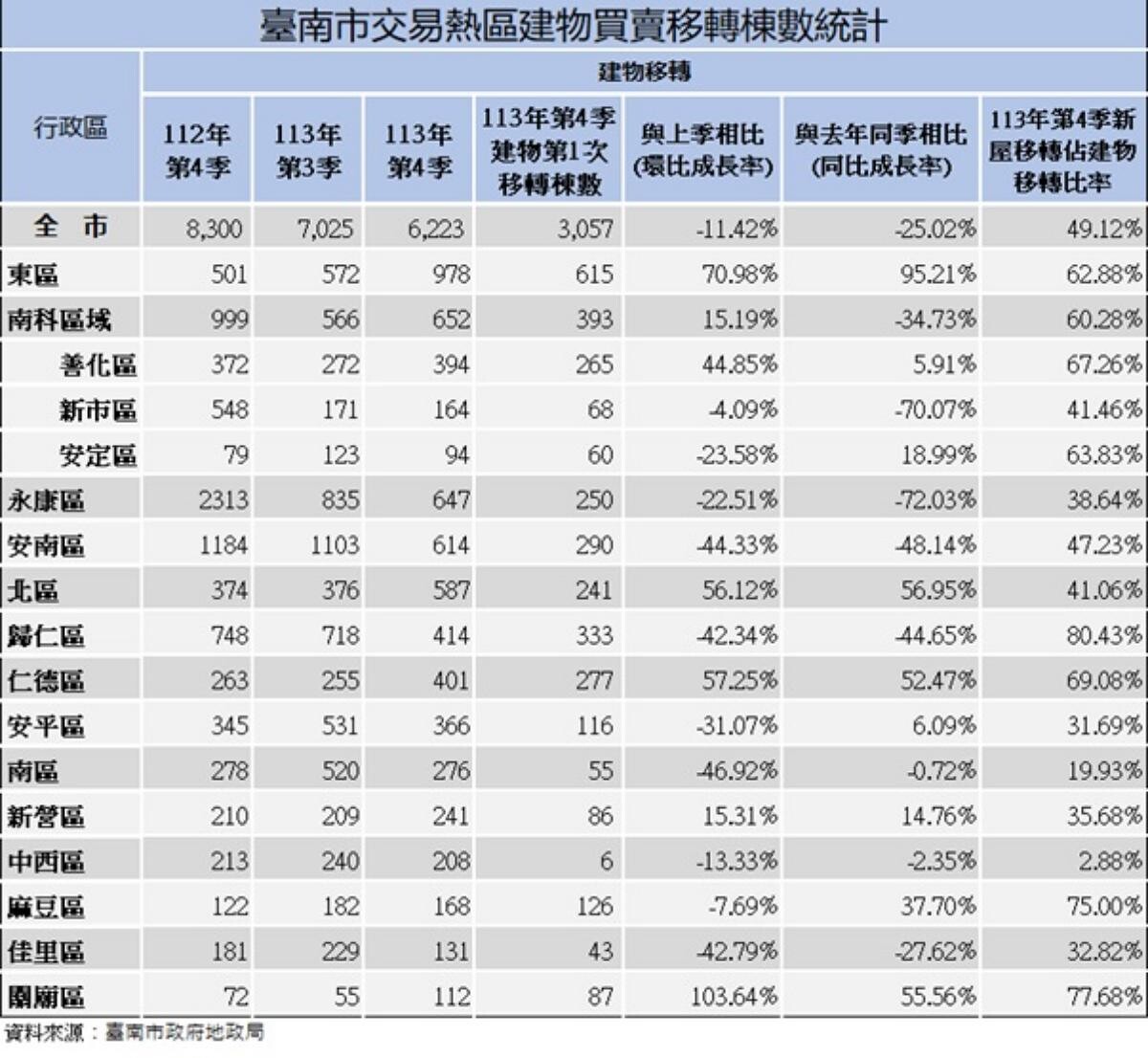 雖然整體交易量縮減,但部分區域仍表現亮眼,特別是東區的建物移轉量達978棟,季增率高達70.98%,年增率更高達95.21%,成為本季交易最活躍的區域。同樣備受矚目的南科區域,第四季建物移轉量達652棟,其中善化區占394棟,為南科區交易量的六成。南科整體交易量雖季增15.19%,但與去年同期相比,仍下滑34.73%。