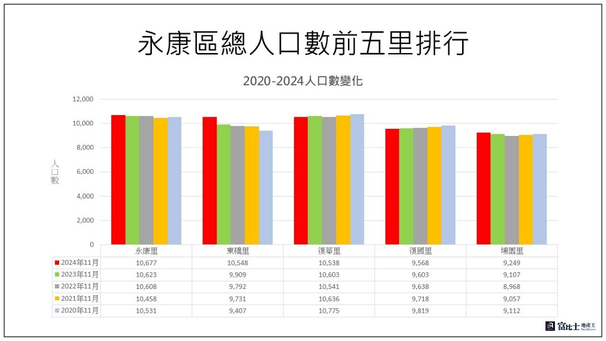 根據台南市永康戶政事務所統計,截至今年11月,永康區總人口數約為23.5萬人。其中,人口數量最多的里為:永康里(10,677人),緊隨其後的是東橋里(10,548人),而復華里(10,538人)則位列第三名。本次統計首次顯示東橋里人口超越復華里,以10人的差距成為永康區第二大里。