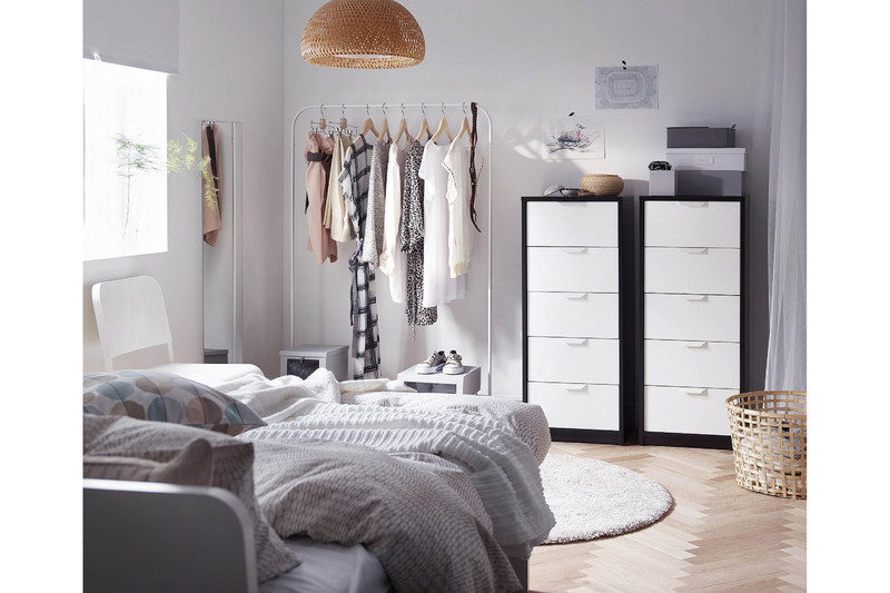 臥室是每天提供我們休息充電的空間,若能擁有整齊舒適的臥室,就能獲得更清爽放鬆的休憩時光。只是不論空間大小,許多人都會有臥室收納空間不足的困擾,IKEA表示,消費者可以先檢視自己衣物的收納需求,例如不怕皺的家居服、休閒服等衣物可摺疊收納在抽屜裡;西裝外套、襯衫或洋裝則可以選擇用衣架吊掛起來。確認自己衣物屬性後,再根據需求挑選收納櫃體、妥善運用空間。IKEA推出許多單櫃系列新品,消費者可隨家中空間挑選使用,如全新的TYSSEDAL系列,圓潤的邊角和經典優雅的白色,替臥室增添一份鄉村風的恬靜氣息;門片上、抽屜櫃上可自由加裝的鏡面也讓每天早晨的換裝打扮更加方便,一致的設計美感,讓臥室充滿功能性和個人風格;ASKVOLL系列有三種不同大小的抽屜櫃及小體積的衣櫃,深色外框搭上白色門板更顯沉穩優雅風格。
