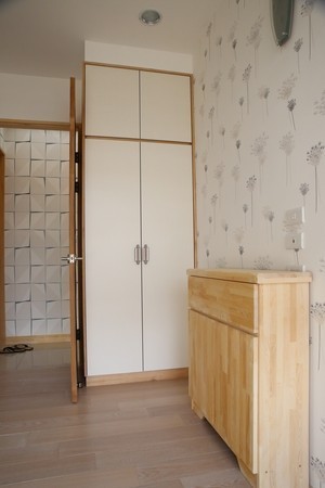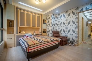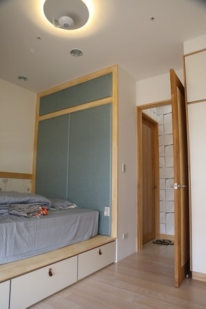 次臥部分,則以北美黃檜的床板挑高床鋪,並將下層做成收納櫃使用。也因應女主人不想要複雜的化妝櫃,僅設計一個小木櫃。讓整體空間在不同木材的紋路和生動活潑的蒲公英壁紙點綴下,創造多層次的低調質感。