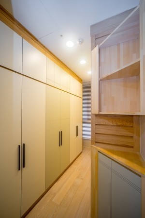 此外,設計團隊也為女主人設置了清新素淨的更衣空間,大量使用的寮國檜木,不僅使屋主打開櫃體時能聞到檜木的清香,天然防蟲的功能更取代化學藥劑的麻煩,讓身心處在空間裡,獲得美好的健康生活。
