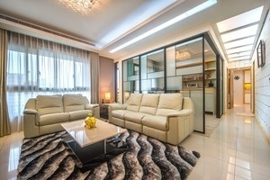 客廳整體以溫潤淡雅的淺色家具和裝潢為主,配合木紋本身具有的流線造型,和華麗的吊燈柔光,不需太多裝飾就能營造舒適宜人的舒壓氛圍。為放大客廳本身的視覺空間,以機能化的隔間方式呈現,同時,設計團隊也將書房的牆面改為玻璃黑框移門,讓客廳的開放自由度大幅抬升。