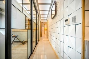 欣賞完客廳,來看看設計團隊如何將單調的廊道化腐朽為神奇。兩側除了原木框架包圍的藍色幾何線條,和蒙德里安圖畫延伸而來的黑色鋁框移門,展現出剛硬與柔和的力美並濟外,牆上的圖畫和天花板方形壁燈漫射出的光線,更使狹長的廊道增添幾許藝術氣息。