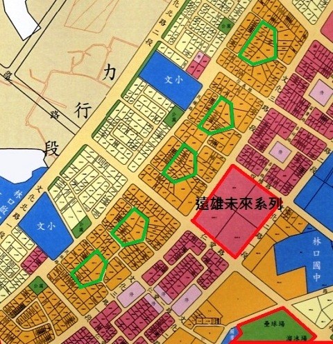 文化三路與民權路中間的土地規劃,有個很不一樣的規劃方式,從下圖我們可以看見中間的區塊,有好多個五邊形、像本壘板形狀的地,這樣的規劃目的是要減緩進入這住宅區的車速,降低噪音、減少排放廢氣量,而且這樣的路口也無須設置紅綠燈,讓大家都可以減少等紅燈的時間。(好處還真多!)這樣的住宅區規劃在英系國家也挺常見的,只是在台灣有些人會在意風水的問題,不過若是不喜歡這樣規劃的人,也是可以選擇對面文化二、三路間的建案。