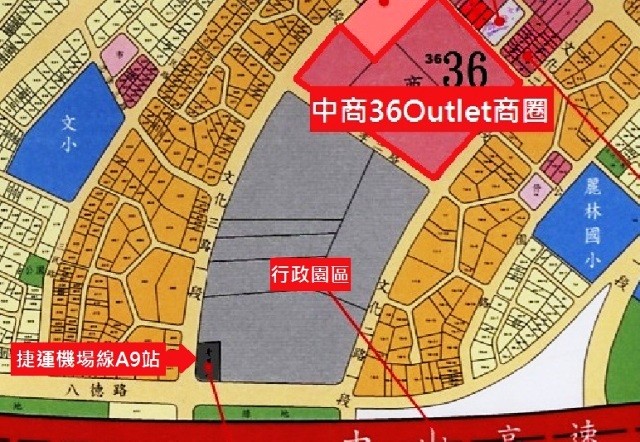【中商36Outlet】從上圖我們也可以看到行政園區旁邊就是「中商36Outlet」預定地,此地面積大約有三個台北小巨蛋大,預計要興建一間國際Outlet購物中心。而新北市經發局在101年2月時曾公告,這個區域將以BOT模式招商,要興建全台最大的Outlet中心,即為品牌暢貨中心。目前時程規畫為101年6月13日截止投標,8月底評選,預計於年底前簽約。預計興建購物商場、電影院、旅館、運動設施、休憩設施等等。