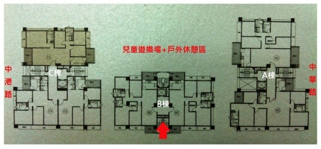 ↑↑↑A棟為圖中右側面中華路(中港綠堤),皆為67坪大四房格局;B棟則位於中間,一樓大廳為住戶出入口,以及地下停車場車道出入口。C棟面對中港路,為三併有三房及四房兩種格局。