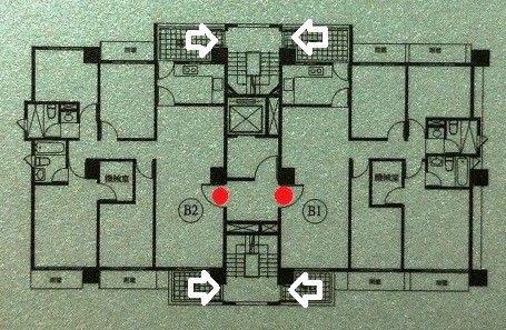 ↑↑↑平時的電梯出入口為紅點處;白色箭頭則是前後陽台通往樓梯的門。