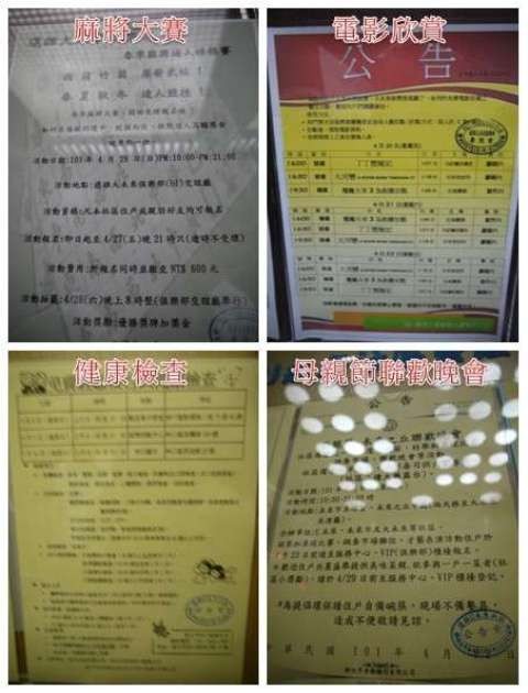 ↑↑↑補上一張這兩個社區有趣的社區活動,麻將大賽、電影欣賞、健康檢查與母親節晚會。母親節晚會有跳蚤市場、才藝表演、桌球比賽,而且住戶可以提供看家拿手菜彼此交流,這活動我覺得很夢幻,如果辦的好,應該會像國外電影一樣吧~~~ (小編自己幻想ING)