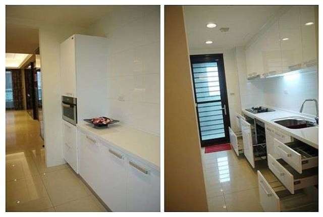 ↑↑↑雙面廚房,高身櫃中間的是蒸爐,流理台左下方的是烘碗機(蒸爐&烘碗機皆為建商附贈,瓦斯爐為林內)