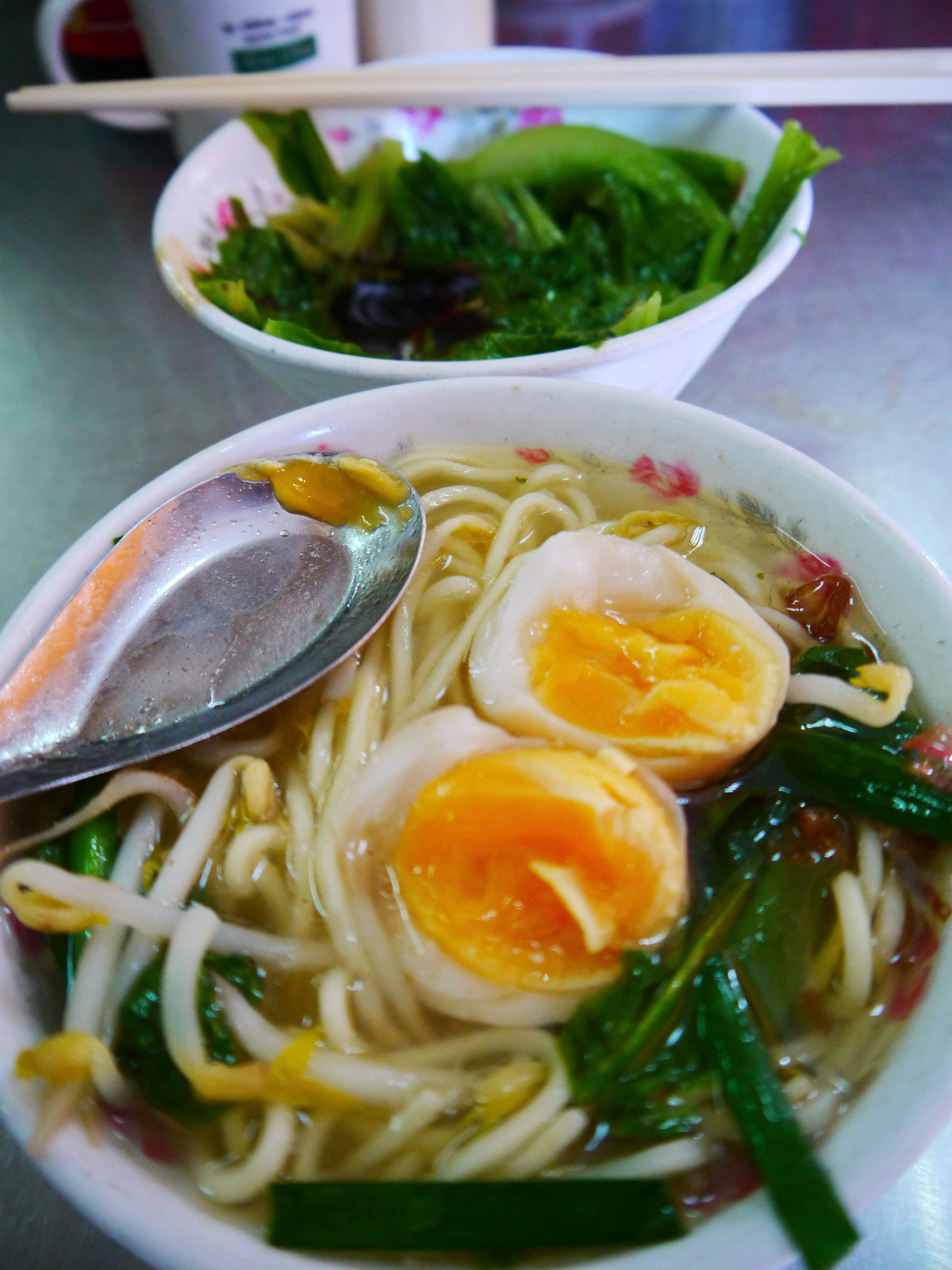 因為沒有菜單,看到別人桌上有啥就跟著點,首先上桌的是切仔麵、黃金蛋與燙青菜。