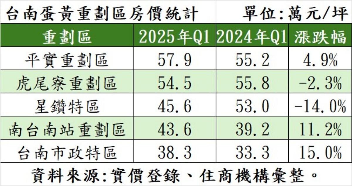 據實價登錄資料,2025年第一季台南市蛋黃區五大重劃區中,以平實重劃區新案每坪均價57.9萬元表現最為亮眼,年增4.9%,穩居區域房價領頭羊地位。住商不動產台南平實加盟店店東蔡瑞堂表示,平實重劃區擁有完整的待開發街廓,更坐擁南紡購物中心等設施,周邊機能完整,加上醫療、學區以及綠地等資源充足,近年來吸引品牌建商齊聚,因此區域即使大環境趨冷,仍能保持房價支撐力道。