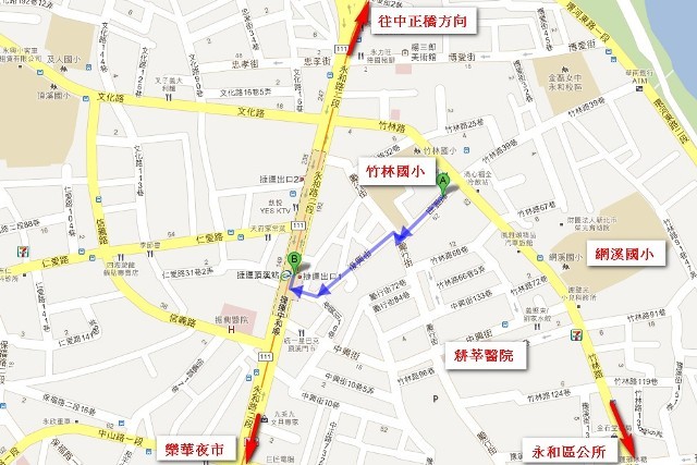 走到永和竹林國小大門不到100公尺吧~竹林國小是蠻有名氣的雙語國小,他們的英語實驗班非常熱門